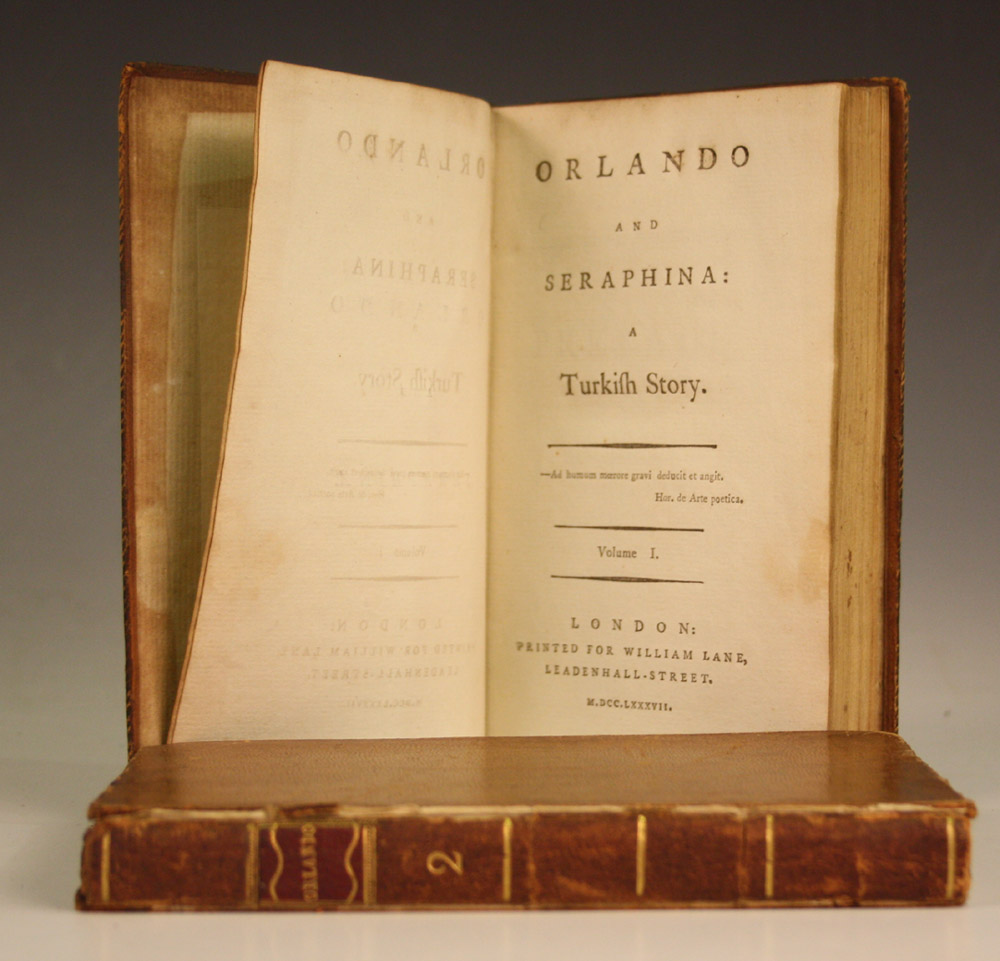 LANE, William (publisher). Orlando and Seraphina: a Turkish Story. London: 1787. 2 vols., 8vo (154 x 94mm.) (Minor browning.) Contemporary calf (joints split, covers detached from vol. II).