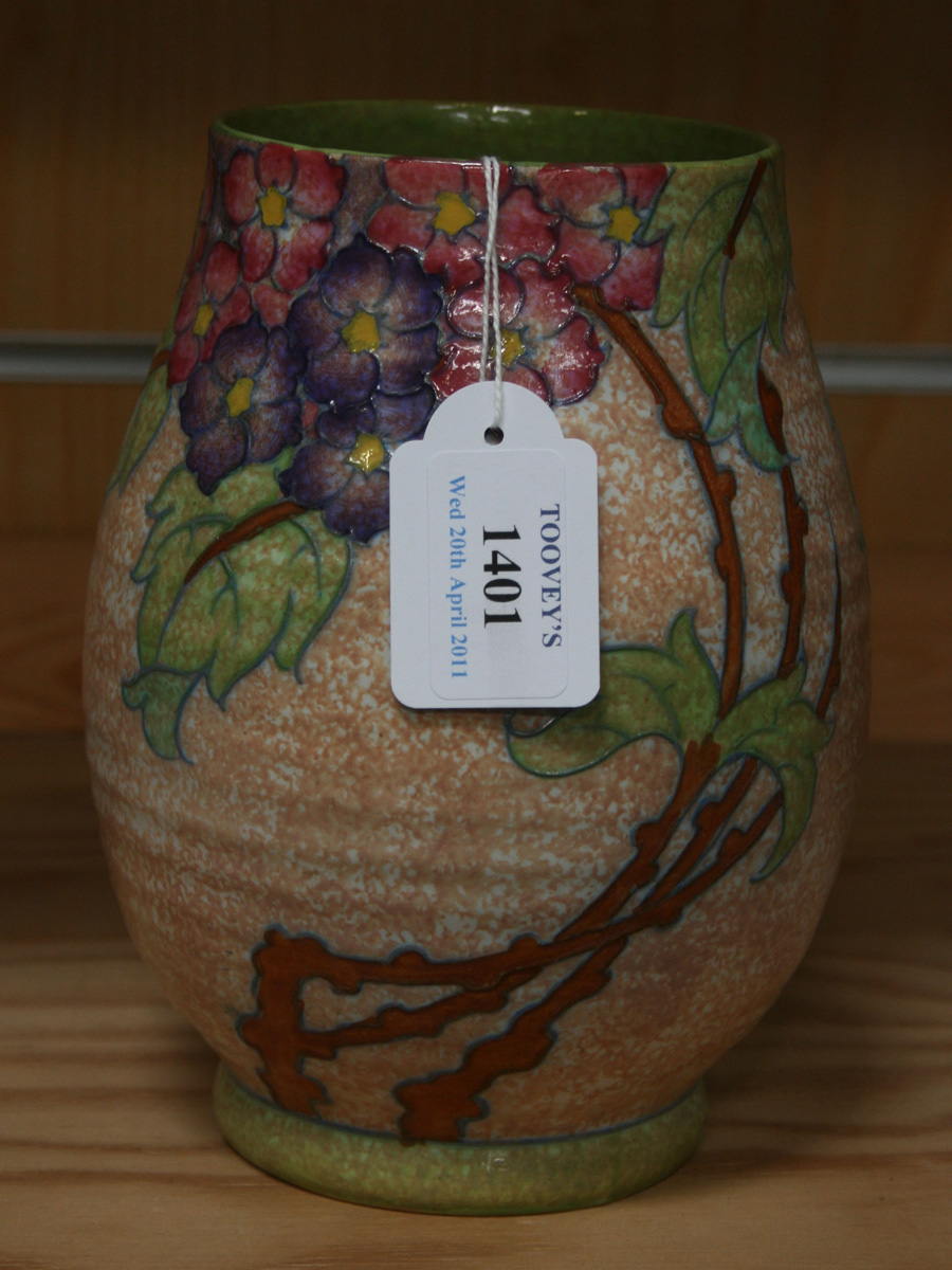 A Crown Ducal swollen ovoid vase designed by Charlotte Rhead, decorated with hydrangea against a mottled brown ground, blue printed and tubelined marks to base, height approx 17.5cm.