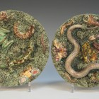 A pair of Jose A. Cunha Caldas Rainha Portuguese pottery dishes, late 19th Century, in the Palissy style, applied with insects and reptiles on a shredded clay grass ground, impressed and incised marks to bases, diameter approx 25cm (some faults and repairs).