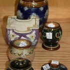 A small group of Doulton stoneware, comprising a small jardinière, a barrel shaped tobacco jar and cover, two match vestas, a lid, and a mustard and cover.