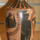 An Etruscan style terracotta ewer, 20th Century, decorated with Odysseus at the mast courted by sirens, height approx 30cm.