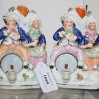 Two Staffordshire pottery figural spill vases, late 19th Century, each modelled as a man holding a pipe seated astride a barrel, the woman beside him holding a glass, on oval gilt lined bases.
