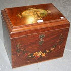 An Edwardian mahogany cellaret painted with cherubs and floral swags, the lid hinged to reveal a compartmentalized interior, width approx 40cm.