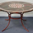 A 20th Century conservatory table, the painted circular top raised on a red painted wrought iron base.