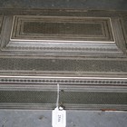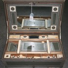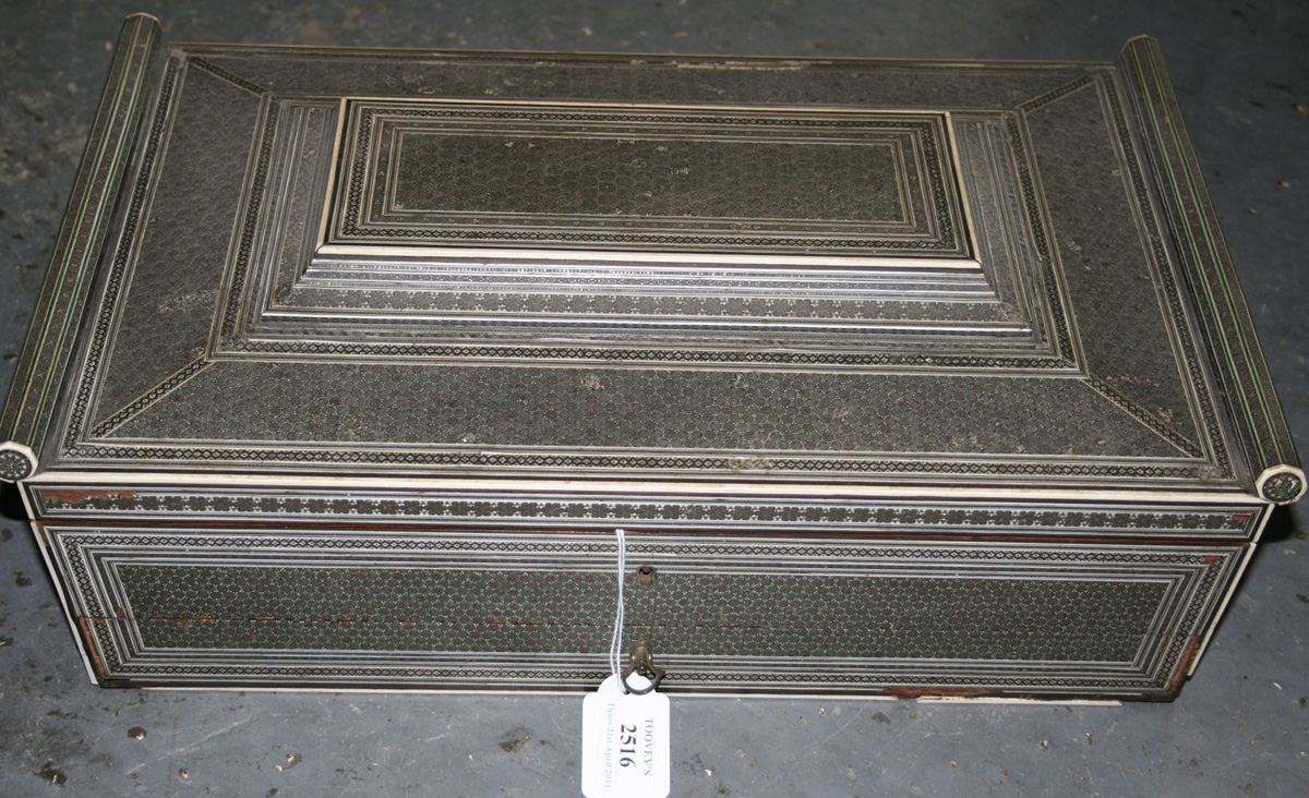 An early 19th Century Anglo/Indian ivory and sedeli work sewing box of sarcophagus form, the hinged lid and tapering sides with overall geometric inlaid decoration, the interior fitted with compartmentalized lidded wells and turned barrel reel holders, the front fitted with a drawer, width approx 46cm (faults).