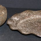 An Indian white metal bowl embossed with foliate scrolls, together with a plated on copper dish decorated with foliage.