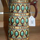 A Wedgwood majolica Caterer jug, late 19th Century, relief moulded with green glazed oval cabochons between lines of horizontal text, turquoise glazed interior, impressed factory mark to base with numerals '638'.