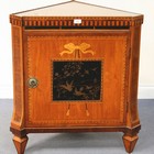 A late 18th Century Dutch satinwood corner cabinet with chequer banded borders, the single door inset with a gilded chinoiserie panel, on tapering legs, width approx 76cm.