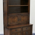 A 20th Century oak bookcase cabinet, the open shelves above a pair of linen fold panelled doors, the base fitted with six drawers, on a plinth base.