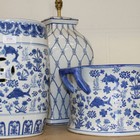 A modern Oriental blue and white porcelain garden seat, three jardinières, a foot bath and a table lamp.