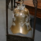 A Chinese bronze bell and hardwood stand, 20th Century, the bell cast in relief with a dragon surmount above trees and deer, the stand pierced with dragons and scrolling tendrils, height approx 71cm, together with a bronze bowl.