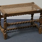 An early 20th Century walnut stool, the caned seat above a carved frieze, on barley twist legs (faults).