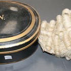 Two late 19th/early 20th Century barrister's wigs, both within tole painted tin boxes, together with two black robes.