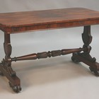 A William IV rosewood library table, the curved rectangular top above a pair of concealed frieze drawers, the two shaped supports united by a turned and carved stretcher, the bracket bases with carved foliate mouldings and scrolling feet, width approx 128cm.