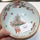 A Chinese 'clobbered' blue and white export porcelain bowl, Qianlong period, embellished in iron red and gilt with flower baskets within trellis borders (star crack and wear).