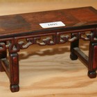 A Chinese hardwood diminutive altar table, 20th Century, the triple panelled top above a pierced scroll frieze, on block legs united by stretchers.