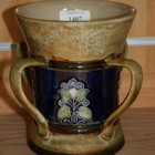 A Royal Doulton stoneware four handled loving cup, of flared cylindrical shape, the green glazed body decorated with four Art Nouveau style flowering plants against a blue glazed band, impressed and incised factory marks to base.