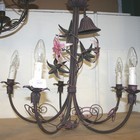 A wrought iron ceiling light, decorated with lily sprays, together with another wrought iron ceiling light.