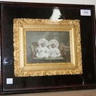A late Victorian hand coloured photograph of two babies in christening gowns, seated on a settee, within a gilt composition slip and rosewood box frame.