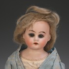 A Cuno Otto Dressel bisque head and shoulder doll, impressed '1902 10/1', with blonde wig, closing blue eyes, painted eyebrows and lashes, and open mouth showing upper teeth, the kid body with bisque lower arms and fabric legs, height approx 35cm.