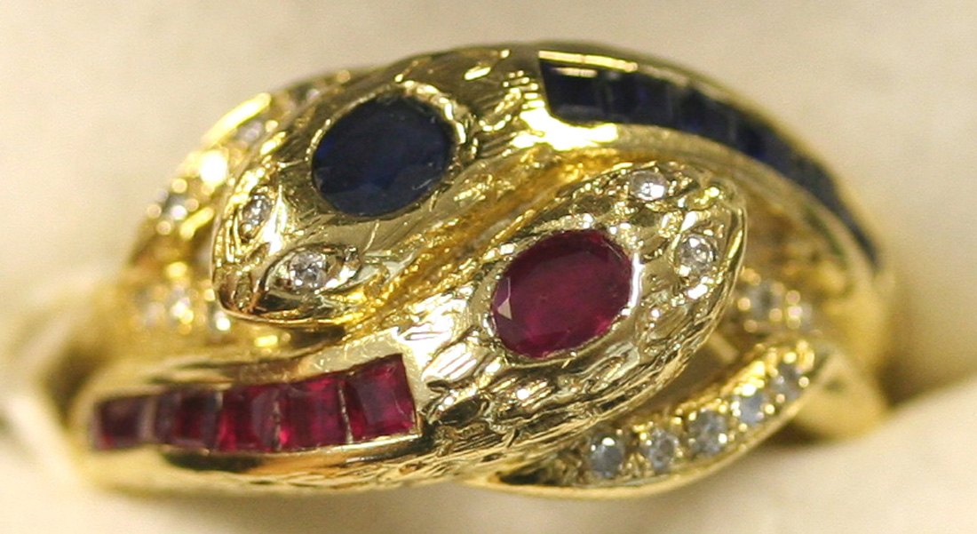 A gold, ruby, sapphire and diamond set ring designed as two conjoined snakes, one mounted with a row of square cut sapphires, the other with a row of square cut rubies, each with diamond set eyes and tails.