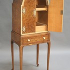 An Art Deco burr walnut dome-topped drinks cabinet, the front fitted with a pair of arched doors and applied with engraved ivorex mounts and banding, the maple-lined interior fitted with two sliding trays, the frieze fitted with a single drawer, on tapering legs and scroll feet, bearing label to underside 'Woodfield Bros....Birmingham', width approx 57cm, height approx 145cm.