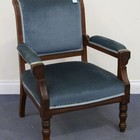 An Edwardian walnut showframe open armchair upholstered in blue velour, together with an Edwardian armchair upholstered in pale green damask.