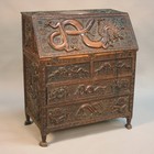 A Chinese hardwood bureau, early 20th Century, profusely carved in high relief with dragons and shou characters, the fall flap enclosing a fitted interior above two short and two long drawers, on shaped feet, height approx 109cm, width approx 93cm.