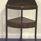 A George III mahogany bowfront washstand, the galleried back above a central shelf fitted with a single drawer flanked by dummy drawers, raised on square tapering and outswept legs, united by an undertier.
