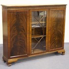 A George V figured mahogany bookcase display cabinet, the blind fretwork frieze above a central astragal glazed door flanked by a pair of panelled doors, on ogee bracket feet, width approx 145cm (faults).