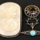 A carved mother-of-pearl large panel shaped brooch, carved as the portrait bust of a lady within a ropetwist surround, a silver mounted oval smoky quartz single stone brooch, and two further brooches.