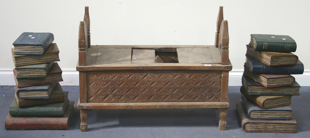 An Eastern box seat stool and a pair of novelty tables in the form of a stack of books.