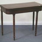 A George IV mahogany fold-over card table, the hinged top with a crossbanded and chequer inlaid border, on turned legs, width approx 91cm.