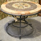 A modern circular marble specimen table top, inlaid in various marbles with a central flowerhead medallion within wide borders, raised on a wrought metal base, diameter approx 106cm.