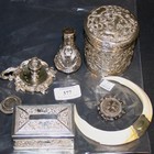 An Elkington & Co plated taper stick holder with floral feet, together with an Indian white metal cylindrical box and cover and a small collection of other items.