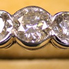 A diamond three stone ring, collet set with a row of circular cut diamonds, with the principal diamond mounted at the centre.