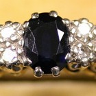 An 18ct gold, sapphire and diamond set ring, mounted with three oval cut sapphires and two pairs of circular cut diamonds mounted at intervals.