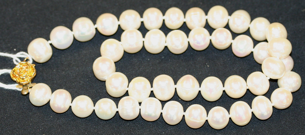 A single row necklace of cultured pearls, on a gilt metal clasp.