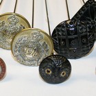 A pair of banded agate hatpins with spherical finials, a carved jet hatpin, the finial in the form of a thistle, a moulded black glass hatpin, the finial in the form of an owl's mask inset with amber glass eyes, together with a collection of other hatpins, including moulded and black glass bead and brass hatpins (35 in total).