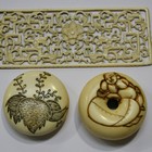 A Japanese ivory manju netsuke, Meiji period, one side carved with Hotei and a sack, another Japanese ivory two section manju netsuke incised and stained with leaves, and a Chinese carved and pierced ivory rectangular panel.