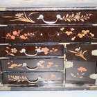 A Japanese lacquer table top cabinet, Meiji period, the copper mounted exterior decorated in gilt with a cockerel and chicken beneath a prunus branch, on a dark brown ground, the pair of hinge doors opening to reveal five drawers and a cupboard door, length approx 44cm (faults).
