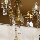 A set of three mid/late 20th Century gilt cast brass three branch ceiling lights, hung with cut glass lozenge drops.