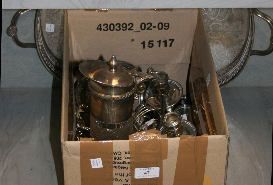 A 20th Century silver six division toast rack, two silver mounted hardwood pepper mills, London 1962, two silver candle snuffers and a silver double ended spirit measure, together with a small collection of plate, including a claret jug and a tray.