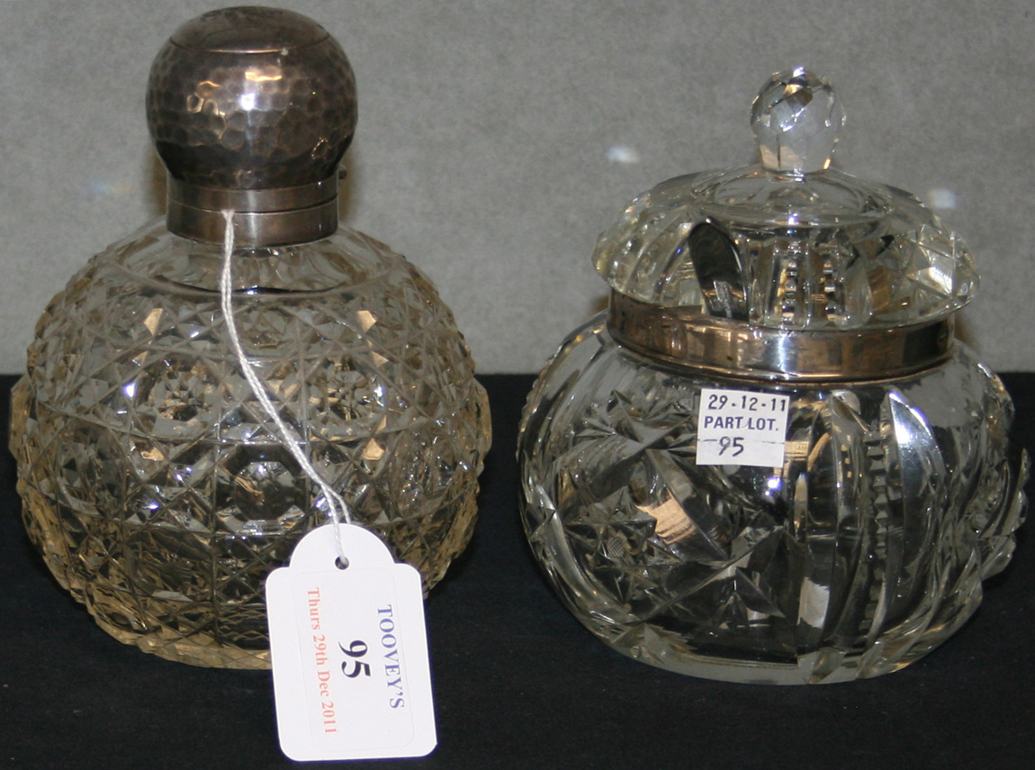 A late Victorian silver and cut glass globular scent bottle, the silver hinge lid with hammered decoration, the glass body with hobnail cut decoration, Birmingham 1900, together with an Edwardian silver mounted cut glass preserve pot and cover with silver collar, London 1907.