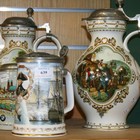 A Royal Worcester 'Nelson's Victory at Trafalgar' National Maritime Museum pewter lidded tankard, together with two Franklin porcelain pewter lidded jugs and another pewter lidded tankard.