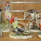 A group of five Capodimonte porcelain figures, late 20th Century, comprising a drunk upon a horse, a fish seller, young girl, postman, and a violinist with girl (minor faults).