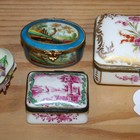A Continental porcelain rectangular trinket box, late 19th Century, the hinged lid painted with a floral spray within gilt scroll framing, the sides with floral sprigs, underglaze blue mark to base, together with two other probably French porcelain snuff or trinket boxes, and a Dresden floral encrusted porcelain box and cover.