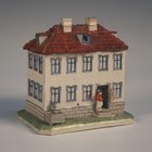 A Ludwigsburg porcelain pastille burner, late 18th Century, modelled as a house with red tiled roof and blue windows, underglaze blue factory mark above incised 'J.W.S' initials to interior, height approx 9cm (minor restoration).