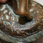 After Eichberg - a pair of late 19th Century German brown patinated cast bronze figures of Dike and Nike, each standing on a circular base bearing cast signature 'Eichberg 90', raised on green marble pedestals, heights approx 27cm and 29cm (faults, Dike lacking scales).