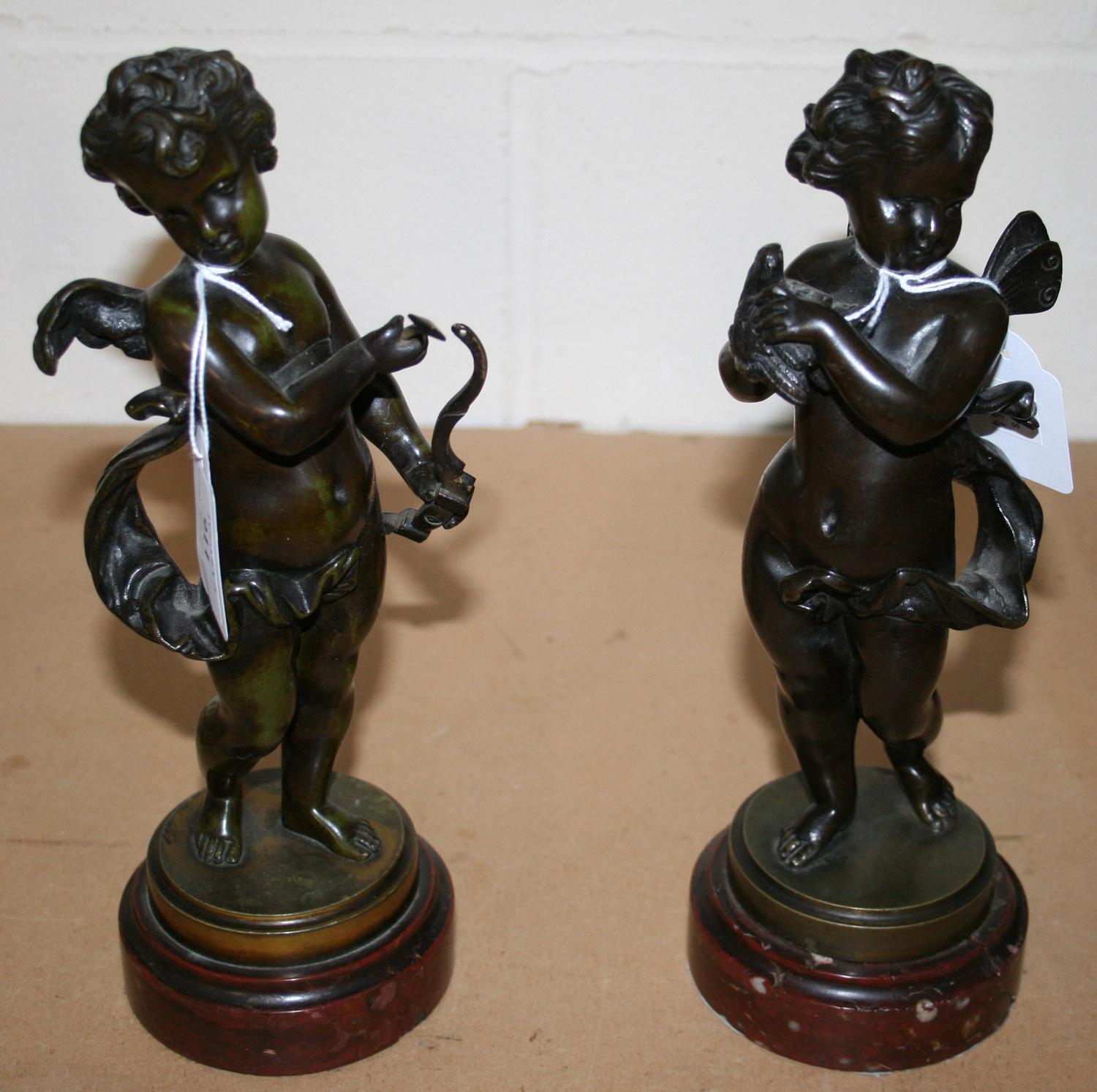 A pair of late 19th Century brown patinated cast bronze figures of standing putti, raised on circular bases and rouge marble plinths, height approx 27cm (faults).